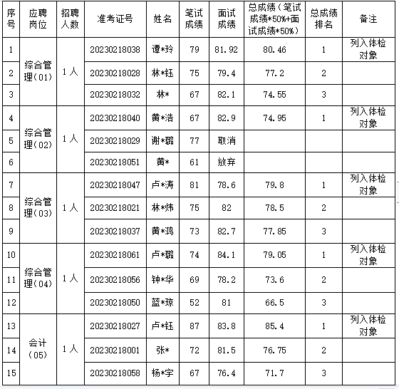•   根據(jù)2023年1月1日發(fā)布的《新羅區(qū)供銷合作社聯(lián)合社關(guān)于公開招聘基層供銷社(集體所有制企業(yè))工作人員的公告》、2023年1月11日發(fā)布的《新羅區(qū)供銷合作社聯(lián)合社關(guān)于公開招聘基層供銷社(集體所有制企業(yè))工作人員的補充公告》有關(guān)要求,新羅區(qū)供銷合作社聯(lián)合社基層供銷社(集體所有制企業(yè))綜合管理(崗位代碼01)等5個崗位考試(筆試+面試)環(huán)節(jié)已經(jīng)組織完成,現(xiàn)將總成績給予公示: